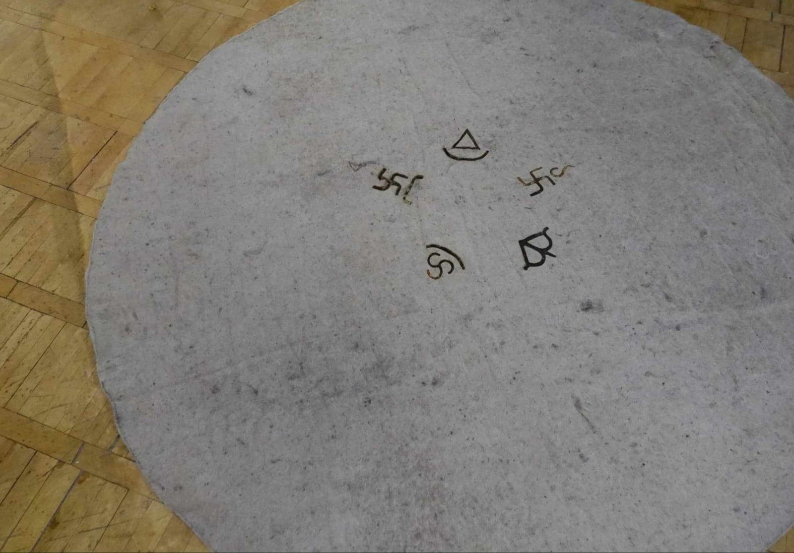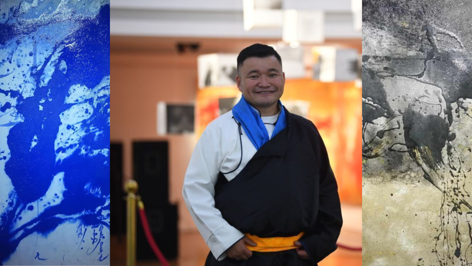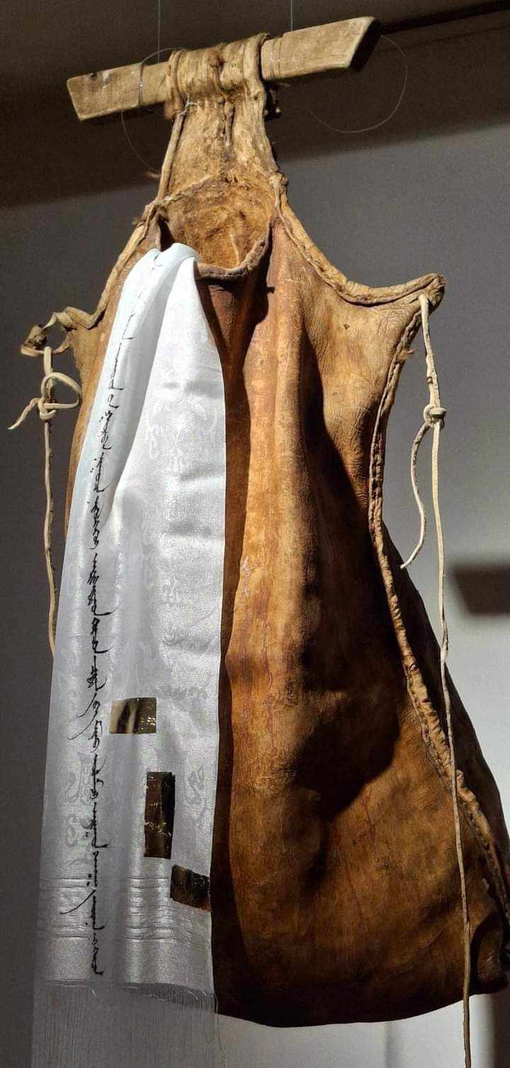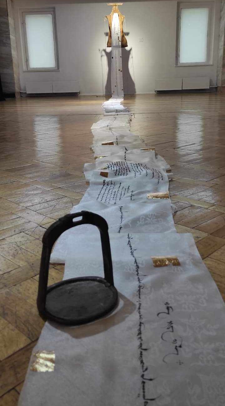 -Тиймээ, энэхүү үзэсгэлэнгээрээ би хэлэх гэсэн санаагаа илэрхийлэхийг хүссэн. Монгол хүн учраас монгол ахуй, өв соёлоо орчин үеийн урлагаар харуулахыг зорьсон. Өнөөгийн нийгэмд бид хэт их хотжиж, ахуйгаасаа их алсарч байна л даа. Тиймээс энэ талаар зовниж явдаг зүйлээ контемпорари болон каллиграфик чиглэлээр хослуулан гаргаж байгаа юм. Таны хэлсэнчлэн хөхүүрээс урт цагаан хадаг унжуулсан нь айраг цагаа исэж саваа дүүргэн цалгиж байгааг илэрхийлсэн хэрэг. Монголчууд бид чинь бүх зүйлээ бэлгэддэг ард түмэн шүү дээ. Энэ хөхүүрэн дээрээ гэхэд “Эртний сайхан”, “ Эрхэм төр” хэмээх хоёр уртын дууг монгол бичгээр бичсэн. “Эртний сайхан” уртын маань эзэн Чингисийн үед найр наадам эхлэхэд дуулдаг хүндэтгэлийн дуу байжээ. Уртын дуу монголчууд бидэнд ийм л хүндтэй зүйл маань юм.