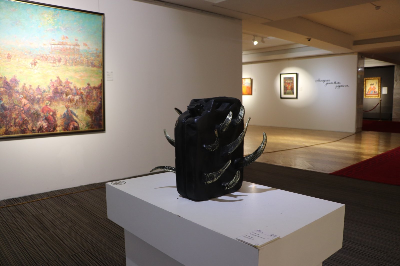 -Уг баримлыг харахад хуучны оросын бензины сав байна. Энэ бензины савнаас эвэр урган гарч ирсэн мэт харагдаж байгаа биз. Сайн ажвал хөдөлгөөнтэй ч юм шиг аль эсвэл царцчихсан шиг дүр төрхийг харуулж байгаа юм л даа. Ерөнхийдөө бол өнгөрсөн нийгмийн доголдолыг илэрхийлсэн эвэр урган гарч ирж байгаа нь миний бүтээлийн ерөнхий утга санаа, зангилаа юм. Тодруулбал, эврээр төлөөлүүлж дархлаа, эргэн сэргэж, гарч ирж байгаа гэсэн санаа л даа. Нөгөө талаас байгаль дээр оршиж байгаа зүйлсийг өөртөө нэгтгэж авдаг гэх давхар санааг ч гаргасан.