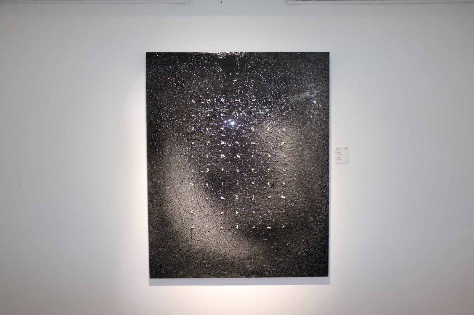 -Тиймээ, ерөнхийдөө энэ бүтээл маань анх харахад усаар норгочихсон, нойтон ч юм шиг харагдах болов уу. Гэхдээ усан дуслууд бөнжигнөөд байгаа биз. Энэ бол усны дуслын перфектийг ашиглаж байгаа орон зай юм. Яагаад перфектийг ашиглаж байгаа вэ гэхээр би өөрөө өмнө нь тийм орон зайн гэрэл болоод оддыг дүрслэх гэж үзээд бүтэлгүйтчихдэг байсан. Харин уг бүтээл маань өөрөө жижигхэн дусал дээр туссан гэрлийн тусгал юм л даа. Түүнийг хэрхэн, бүүр жижигхэн болгох, аль эсвэл од шиг гэрэл гэгээ цацруулж болох зэрэг нь уг гэрлийн тусгалаас хамааралтай. Бүтээл дээр туссан хүчтэй гэрлийг унтраачихвал зүгээр нэг хөлөрсөн хана болно. Тэгэхээр гэрлээсээ шалтгаалж, эффект тоглолттойгоор үзүүлж болохоор бүтээл.