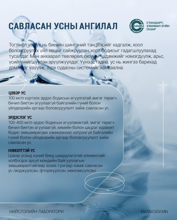 100 мг/л хүртэлх эрдэс бодисын агуулгатай эмгэг төрөгч бичил биетэн агуулаагуй байгалийн гүний болон үйлдвэрийн аргаар боловсруулалт хийж савласан ус;