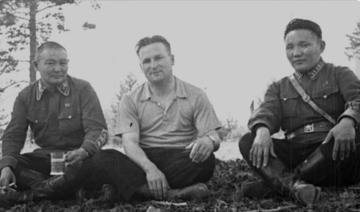 -Монголд таны аавын тухай кино хийгдэж байна. Тэр кинонд тоглож байгаа жүжигчдийг танд харуулах гэсэн юм. Маршалын дүрд А.Дашпэлжээ гуай тоглож байгаа. Их төстэй харагдаж байгаа биз ?