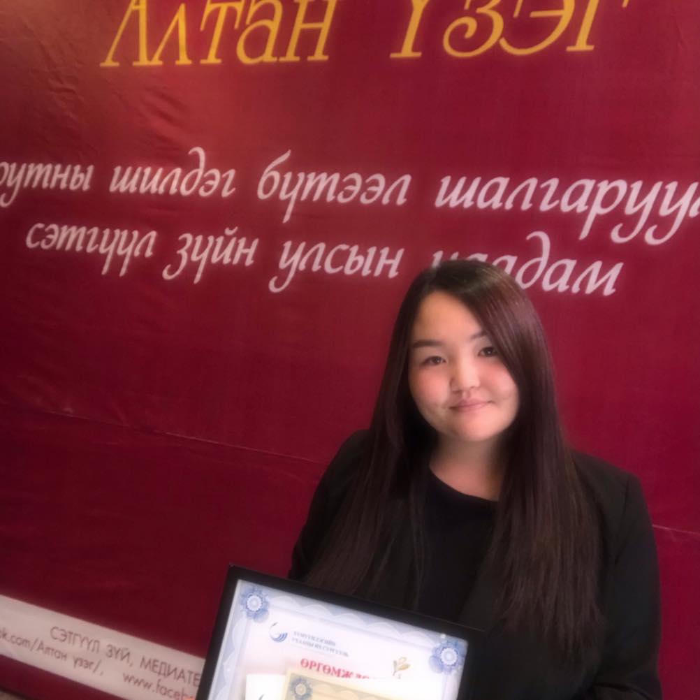 -Бичсэн бүтээл маань гуравдугаар байрт орсон. 2021 онд “Үндэсний шуудан” сонин дээр нийтэлж гаргасан. 2022 онд шинэ сургалтын байртай болсон байна билээ. Тэрийг хараад би маш их догдолсон. Тэр сэтгэл хөдлөлдөө хөтлөгдөөд “фэйсбүүк”-тээ “Сайхан тохижуулжээ, баяр хүргэе” гэж бичсэн. “Хараагүйчүүдийн холбооны пэйж” хуудаснаас “Баярлаа” гээд коммент бичсэн. Тэр “баярлаа” гэдэг ганц үг “Чи сэтгүүлч хүн болж чадна” гэж хэлж байгаа юм шиг надад туссан. Сэтгүүлч хүн сэтгэл зүрхээ урдаа барьж явах хэрэгтэй. Хахир хатуугаар сэтгүүл зүй хийнэ гэвэл юу болох вэ? Сэтгүүлч хүн өөрт байгаа хүчээ хүний сайн сайхны төлөө зориулах хэрэгтэй. Хамгийн гол нь сайн ярьдаг биш маш сайн бичдэг сэтгүүлч болмоор байна.