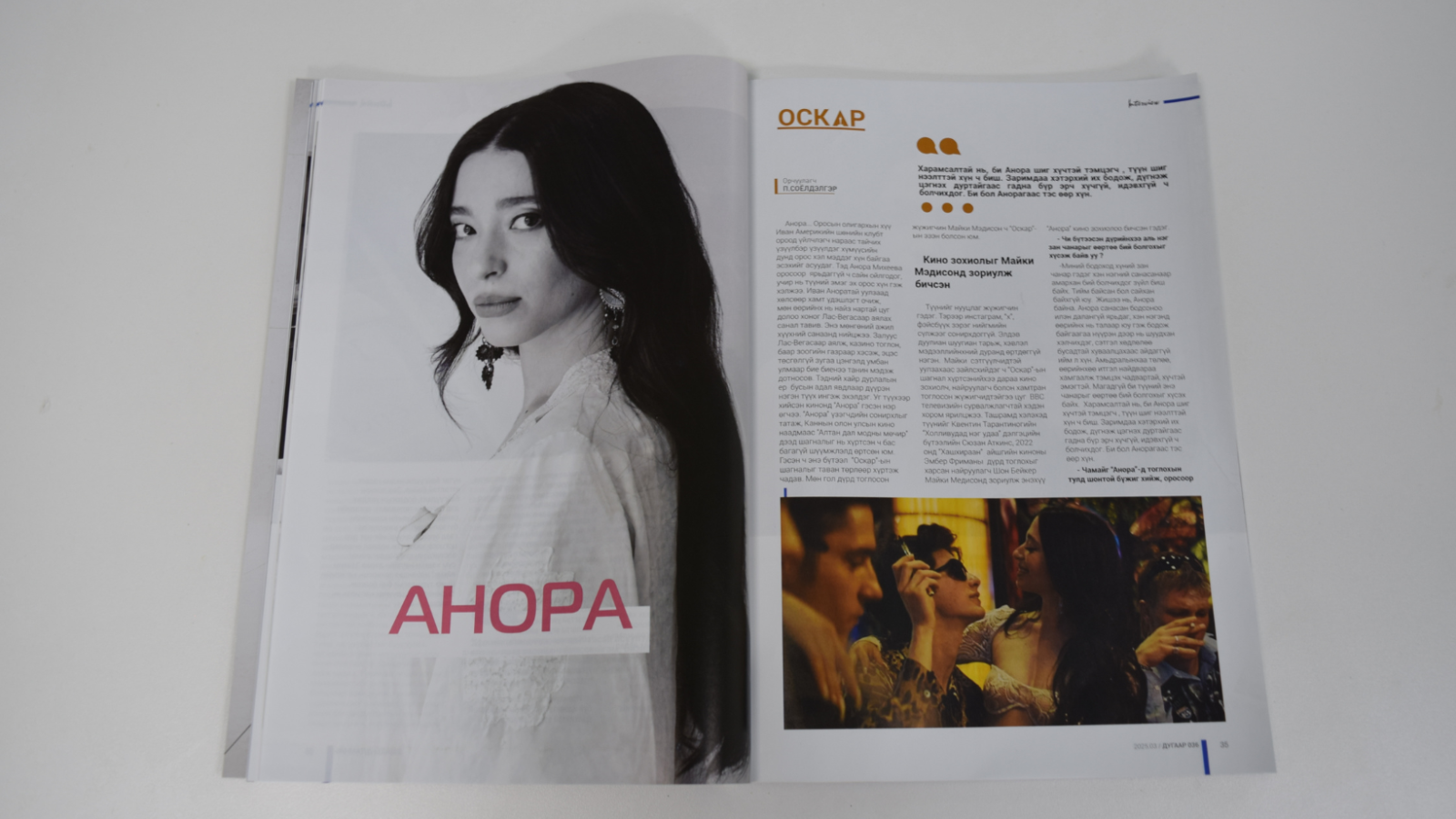 Анора... Оросын олигархын хүү Иван Америкийн шөнийн клубт ороод үйлчлэгч нараас тайчих үзүүлбэр үзүүлдэг хүмүүсийн дунд орос хэл мэддэг хүн байгаа эсэхийг асуудаг. Тэд Анора Михеева оросоор ярьдаггүй ч сайн ойлгодог, учир нь түүний эмэг эх орос хүн гэж хэлжээ. Иван Аноратай уулзаад хөлсөөр хамт үдэшлэгт очиж, мөн өөрийнх нь найз нартай цуг долоо хоног Лас-Вегасаар аялах санал тавив. Энэ мөнгөний ажил хүүхний санаанд нийцжээ. Залуус Лас-Вегасаар аялж, казино тоглон, баар зоогийн газраар хэсэж, эцэс төсгөлгүй зугаа цэнгэлд умбан улмаар бие биенээ танин мэдэж дотносов. Тэдний хайр дурлалын ер бусын адал явдлаар дүүрэн нэгэн түүх ингэж эхэлдэг. Уг түүхээр хийсэн кинонд “Анора” гэсэн нэр өгчээ. “Анора” үзэгчдийн сонирхлыг татаж, Каннын олон улсын кино наадмаас “Алтан дал модны мөчир” дээд шагналыг нь хүртсэн ч бас багагүй шүүмжлэлд өртсөн юм. Гэсэн ч энэ бүтээл “Оскар”-ын шагналыг таван төрлөөр хүртэж чадав. Мөн гол дүрд тоглосон жүжигчин Майки Мэдисон ч “Оскар”-ын эзэн болсон юм.