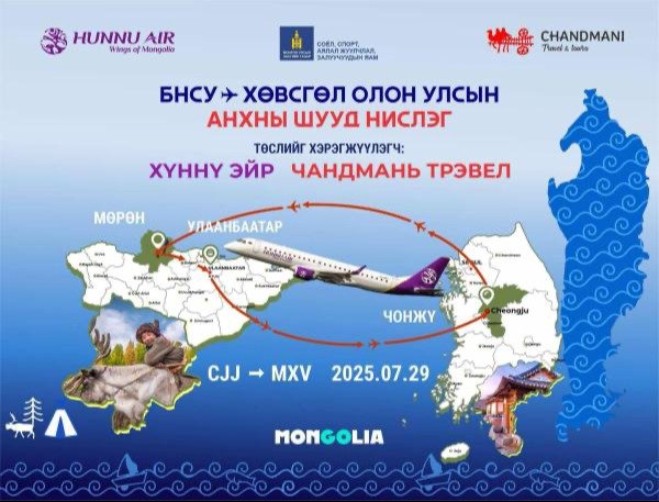 БНСУ-ын Чонжү хотоос Хөвсгөл аймгийн Мөрөн сум чиглэлийн олон улсын анхны шууд нислэг ирэх долдугаар сарын 29-өөс эхлэх гэж байна. Энэхүү түүхэн нислэг нь манай улсын аялал жуулчлалын салбарын хөгжилд бодит хувь нэмэр оруулах шинэ төсөл гэдгийг албаныхан онцолж байгаа.