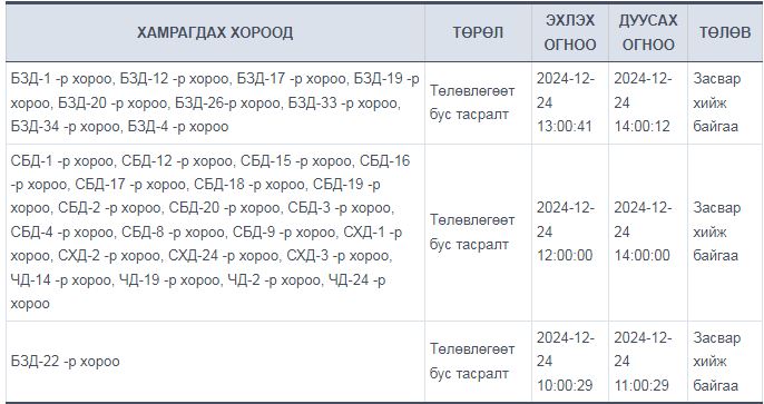 Өнөөдөр /2024.12.24/ 10:00-14:00 цаг хүртэл нийслэлийн зарим хороонд цахилгаан эрчим хүч хязгаарлаж, төлөвлөгөөт бус засварын ажлыг хийхээр болсныг "Улаанбаатар Цахилгаан Түгээх Сүлжээ" ТӨХК-аас мэдээлэв.