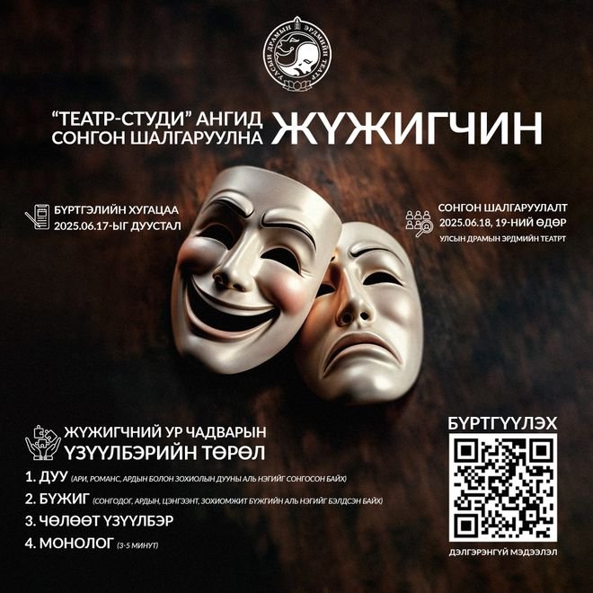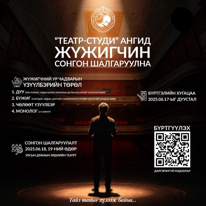 Улсын драмын эрдмийн театрын дэргэдэх “Театр-студи” ангид жүжигчин сонгон шалгаруулах шалгалт энэ сарын 18, 19-нд Улсын драмын эрдмийн театрын байранд зохион байгуулагдана. Уг шалгаруулалтад мэргэжлийн урлагийн их дээд сургуулиудад жүжигчин, найруулагчийн мэргэжлээр дээд боловсрол эзэмшсэн бакалаврын дипломтой уран бүтээлч орно. (Нас харгалзахгүй)