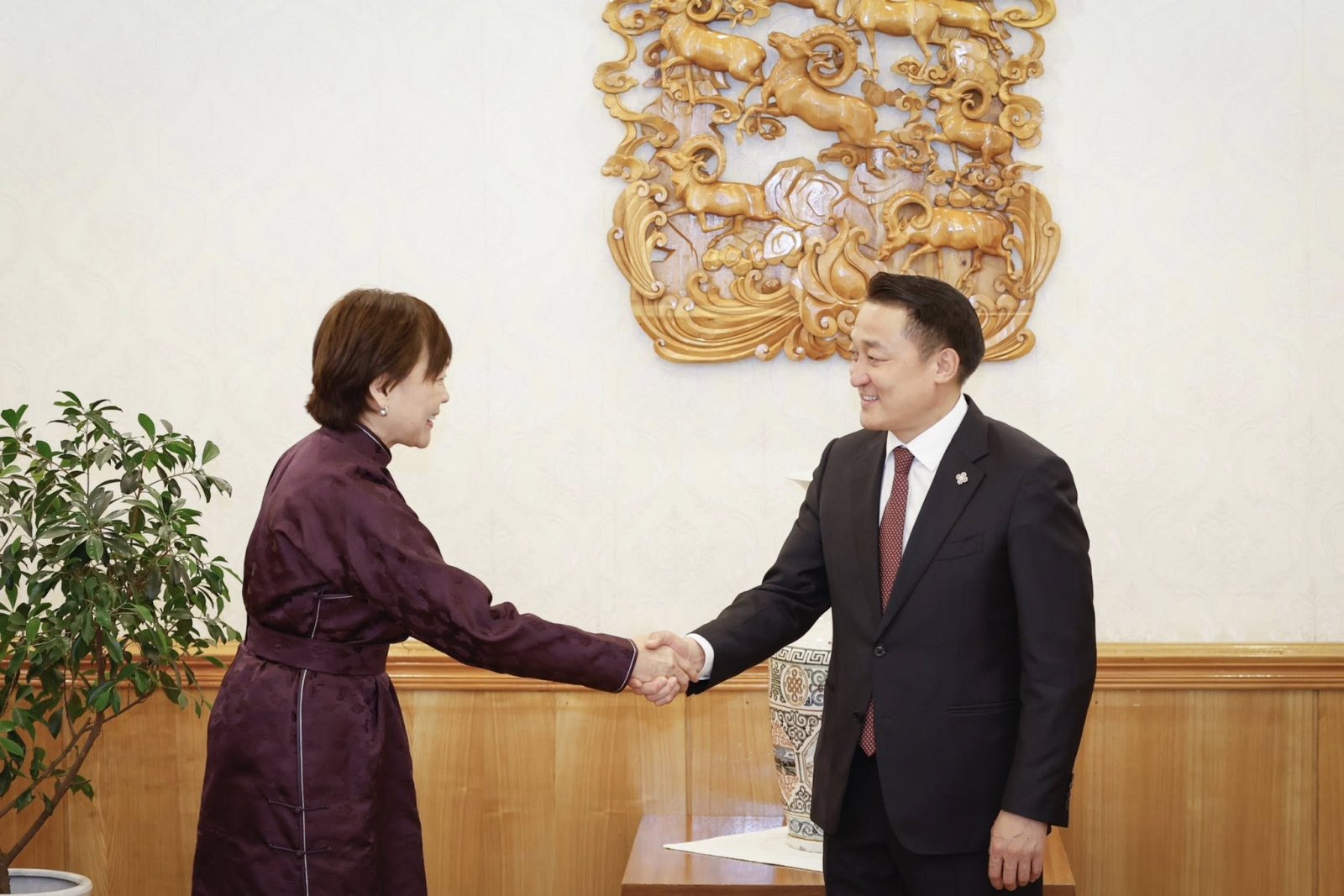 Тэрбээр, "Энэ жил Япон улсын Эзэн хаан, хатан нар Монголд айлчлалаа хийх гэж буйг сонсоход үнэхээр баяртай байна гээд энэ нь бидний өвөг дээдэс, мөн миний нөхөр, Ерөнхий сайд агсан Абэ Шинзо нарын хүч хөдөлмөрийн үр дүнд бүтээсээр ирсэн Япон-Монголын харилцаа улам гүнзгийрч буйг илтгэх бодит бэлгэ тэмдэг билээ.